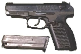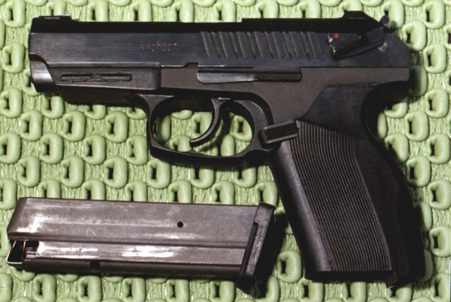 Рычаг предохранителя может перемещаться дальше фиксированного положения, при этом он работает как рычаг сброса ударного механизма с боевого взвода. В фиксированное положение предохранитель возвращается пружиной. Магазин со стальным корпусом, двухрядный, с двухпозиционным расположением патронов на подаче. Защелка магазина расположена за спусковой скобой и перемещается в поперечном направлении. Она может переустанавливаться под правую или левую руку. Прицел нерегулируемый, с тремя контрастными точками (одна на мушке и две на целике). В конструкции пистолета воплощен и ряд рациональных с точки зрения эргономики новых дизайнерских решений. Это - эластичный выступ на торце рукоятки с выпуклыми рифлениями, передающий на руку импульс отдачи, минимальный периметр обхвата рукоятки и размещение основных управляющих элементов пистолета в зоне дуги, описываемой большим пальцем руки.