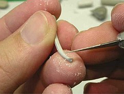 Работа над формой: острая овальная палочка служит для придания формы, модельный нож - для резки и доводки и смоченная в воде кисть - для сглаживания шероховатостей и неровностей.